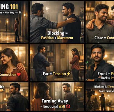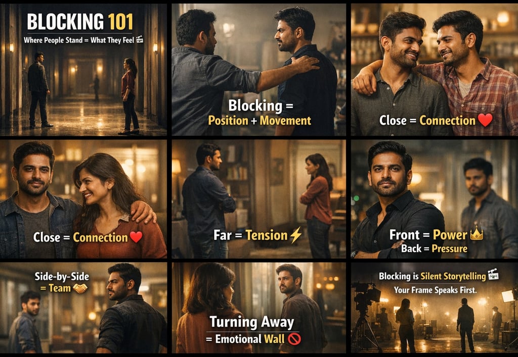 Learn blocking in filmmaking with simple examples. Discover how actor positioning shows power, tension, intimacy, and emotion—without dialogue.